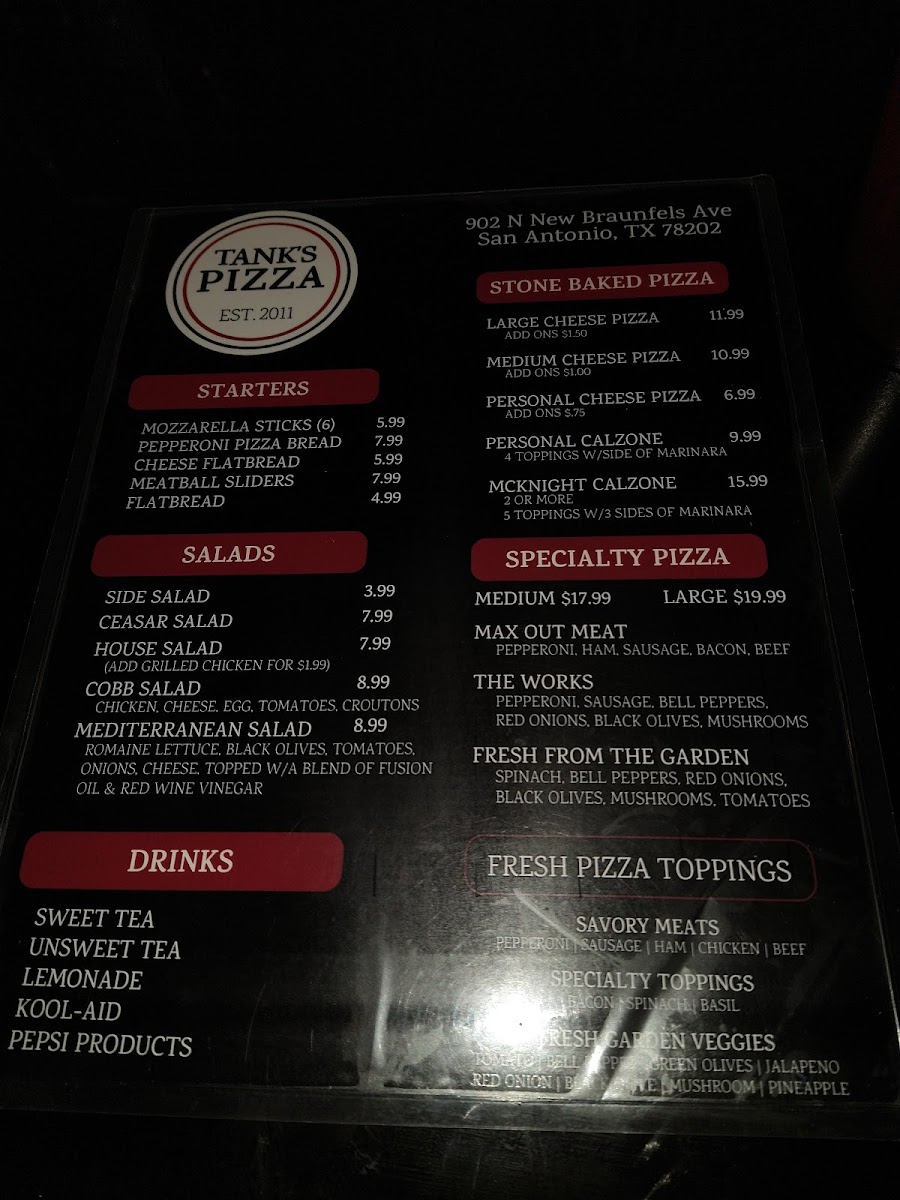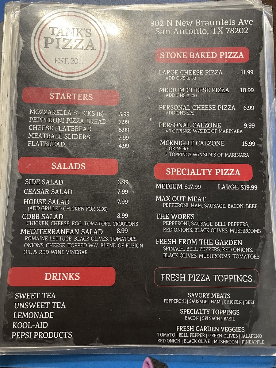 Welcome to Tank's Pizza, where flavor and family converge in a warm, inviting atmosphere. Located at 902 N New Braunfels Ave in San Antonio, this spot is a treasure trove for pizza lovers and families alike. The menu features an irresistible array of options, starting with their signature pizzas that promise the perfect balance of crispy crust and mouthwatering toppings.
